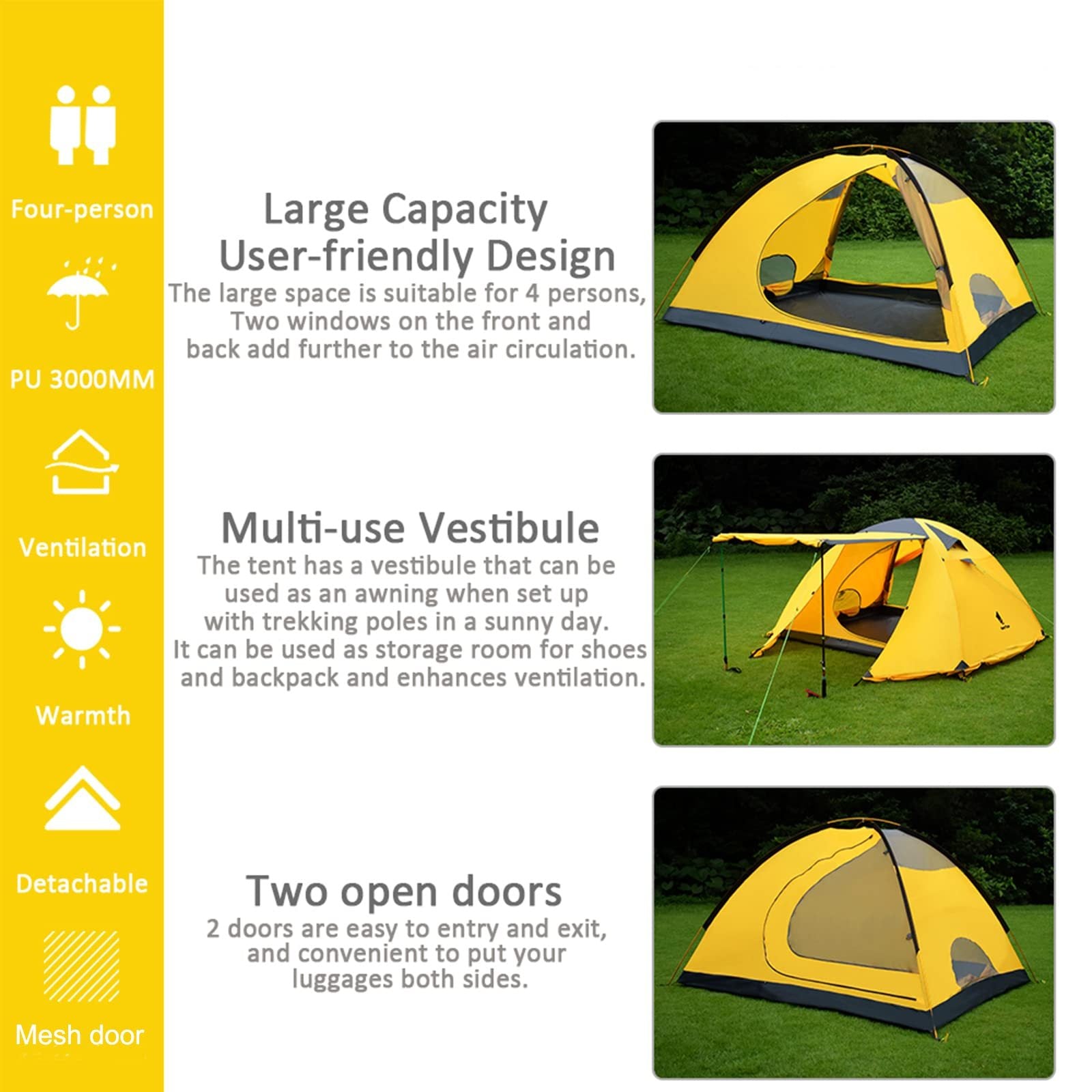 Zusätzliche Informationen: Das 2-Personen-Backpacking-Zelt kombiniert Stil, Komfort und Funktionalität. Durch sein innovatives Skylight-Design und die doppellagige Struktur ist es die perfekte Wahl für Abenteurer, die ein leichtes, atmungsaktives und wetterfestes Zelt suchen.