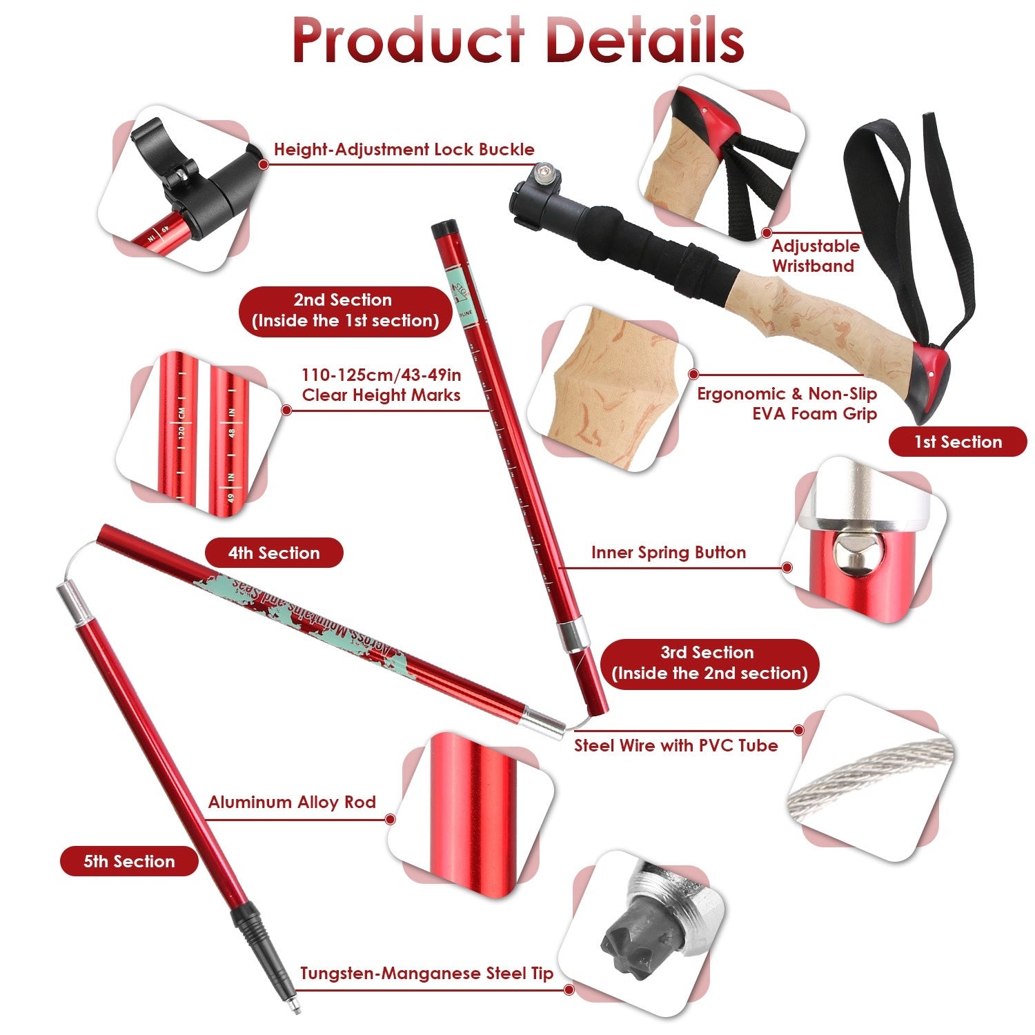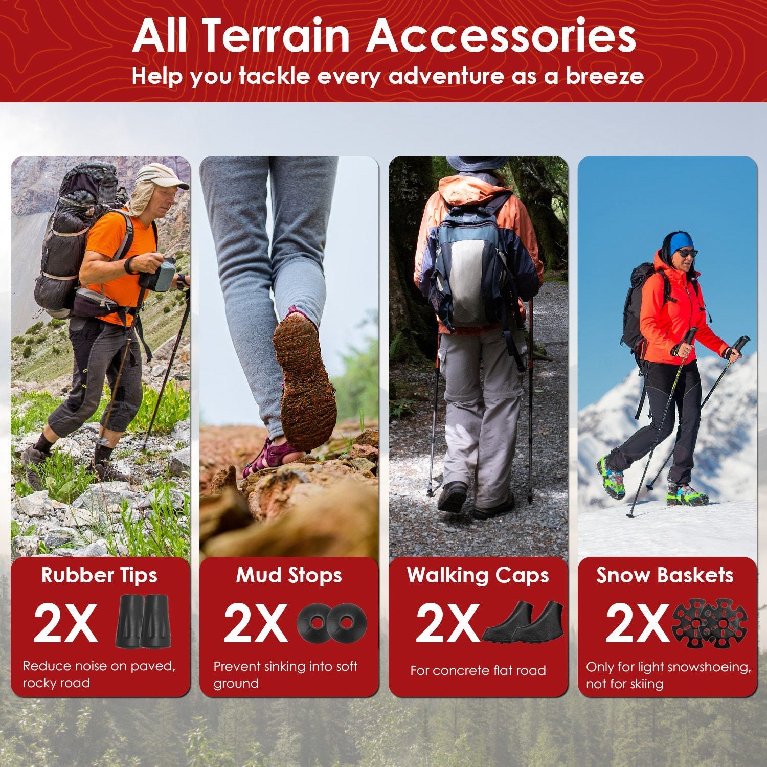 - Lieferumfang: 2 Trekkingstöcke + Zubehör (Spitzen, Tasche)