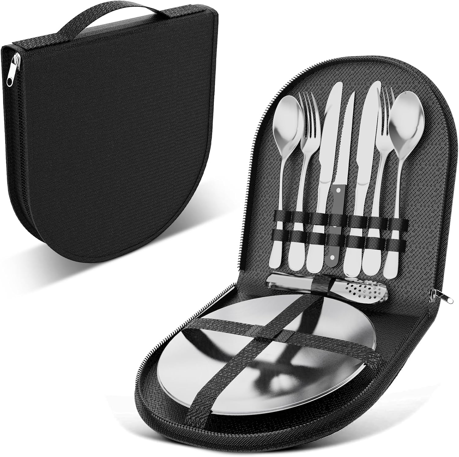 - 10-piece cutlery set: the camping cutlery set contains 2 forks, 2 plates, 2 spoons, 2 table knives, 1 steak knife, 1 steak clip and 1 portable storage bag. It is perfect for 2 people for various outdoor activities, such as picnics, camping.
