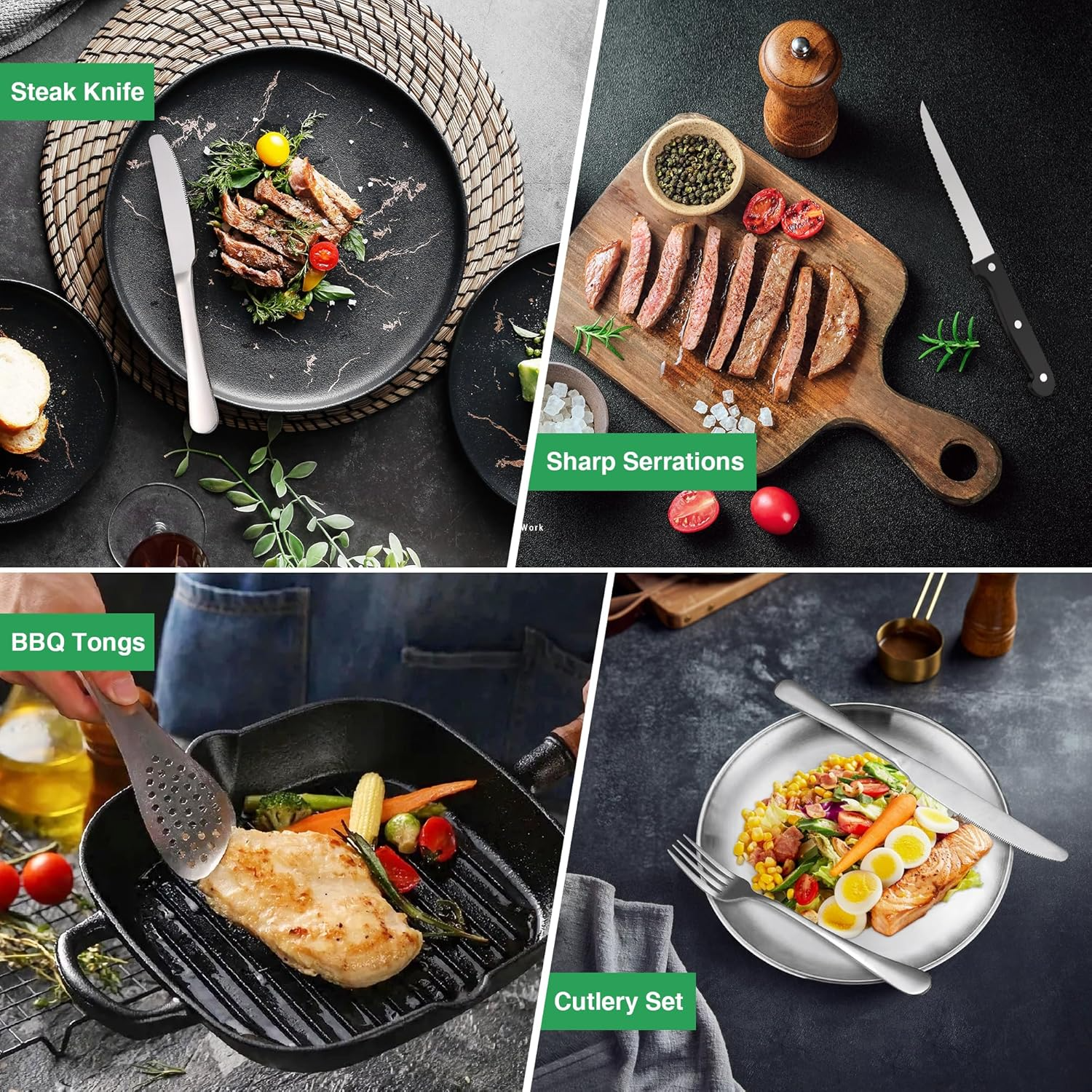 - Stainless steel camping tableware set: Our camping tableware set is made of food-grade stainless steel, shatterproof, heat-resistant, durable and dishwasher safe.
